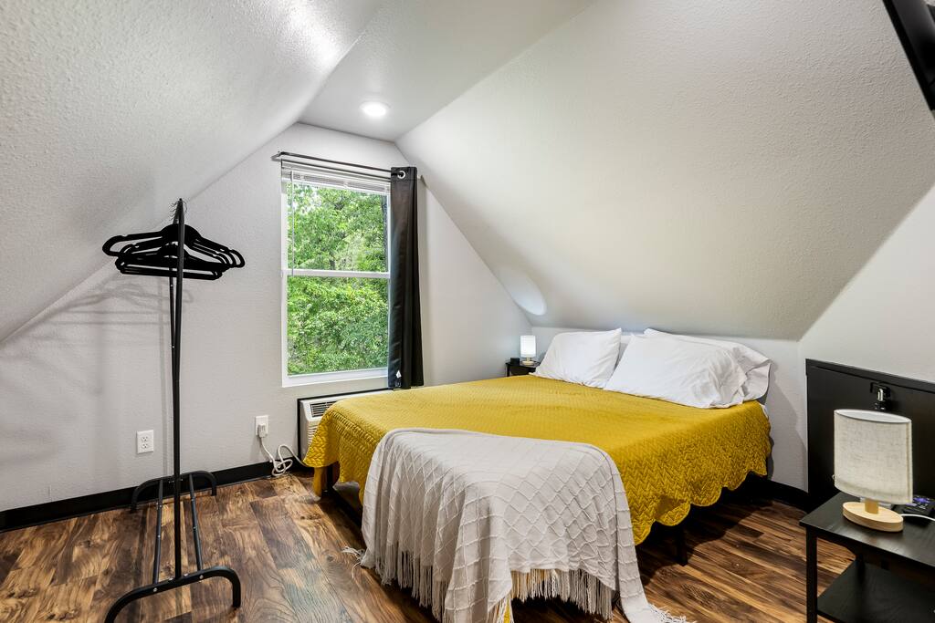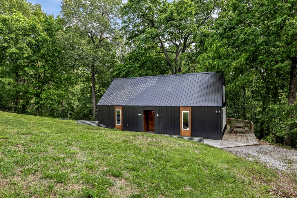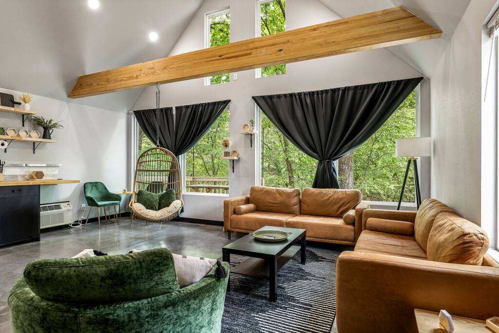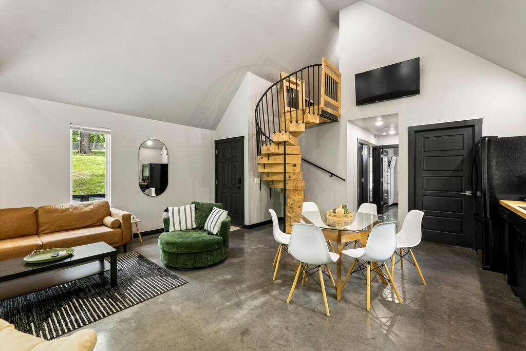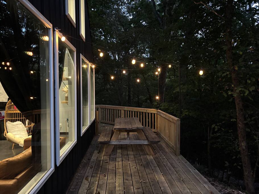 An Amazing, Modern Cabin sits it a private, wooded setting just moments outside Elm Springs, AR. While this location offers convenient access to adventures and activities around Northwest Arkansas you may not want to leave! Quietly nestled in a treed acre of land, you'll love the unique style and charm throughout. 3 Bedrooms and 2 bathrooms (1 of each up the charming spiral staircase) plus an open living space with high ceilings and lots of windows! Come for a weekend or a month!